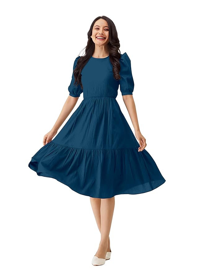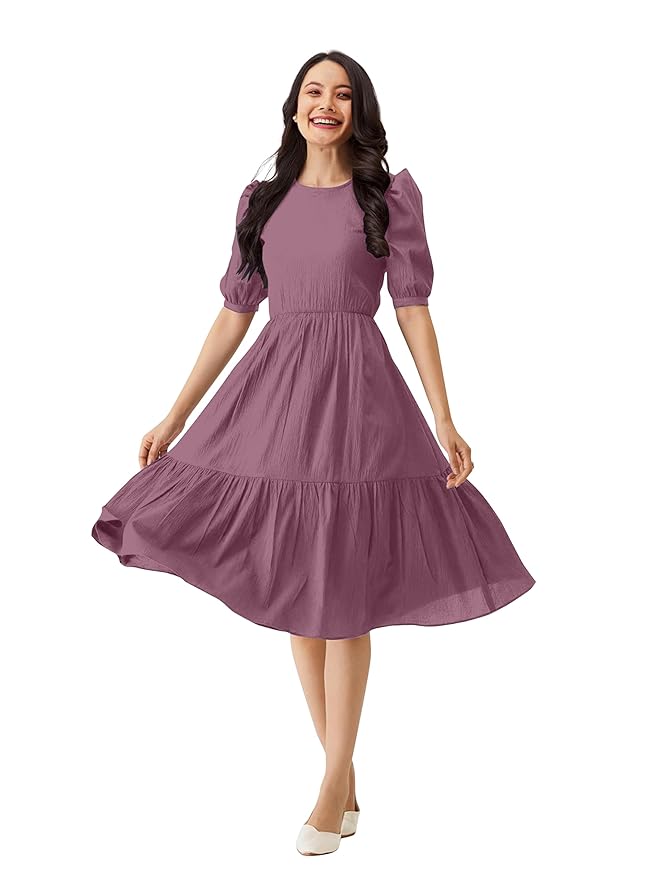 short dress, UncategorizedTRENDMALLS Dress for Women Cotton Blend Round Neck Half Puff Sleeve Flared Pleated Midi Western Dress